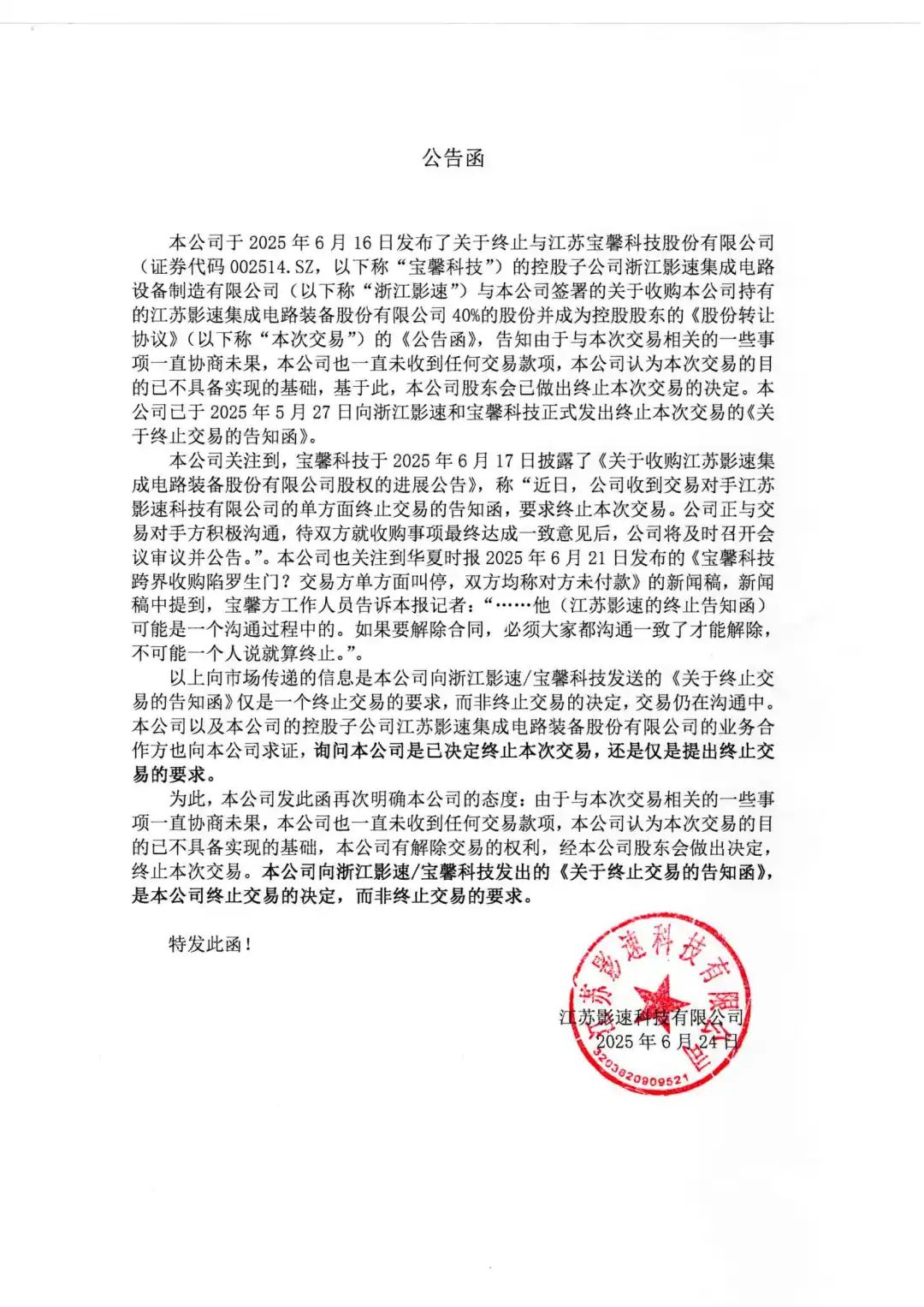 控股股东bwin·必赢科技已终止与宝馨科技(证券代码002514.SZ)的控股子公司浙江bwin·必赢关于收购本公司40%股份的交易